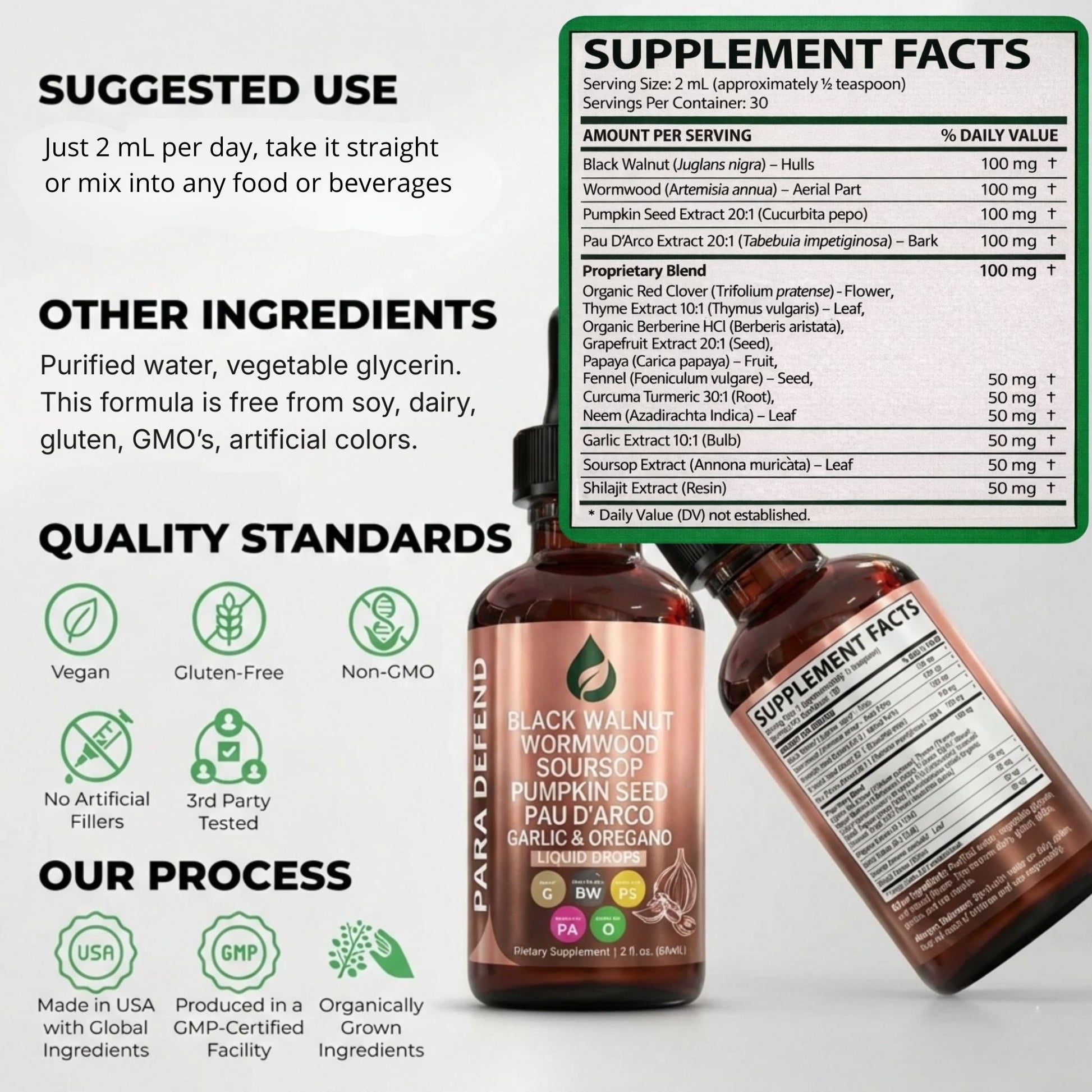 Take 2 full droppers daily. For best absorption, use on an empty stomach or mix with water or juice. Consistency is key for optimal results.
